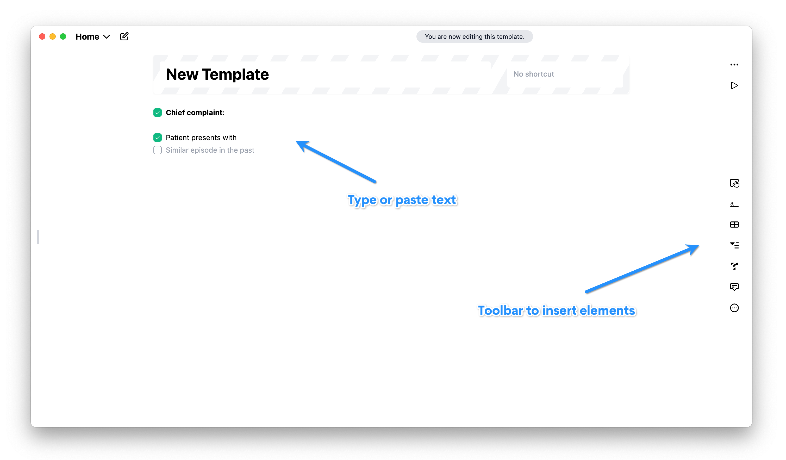 Next, add content to your template. Simply type in the text you’d like to include. If you have templates you would like to bring from other apps or EMRs, you can copy and paste the text into Dilato.