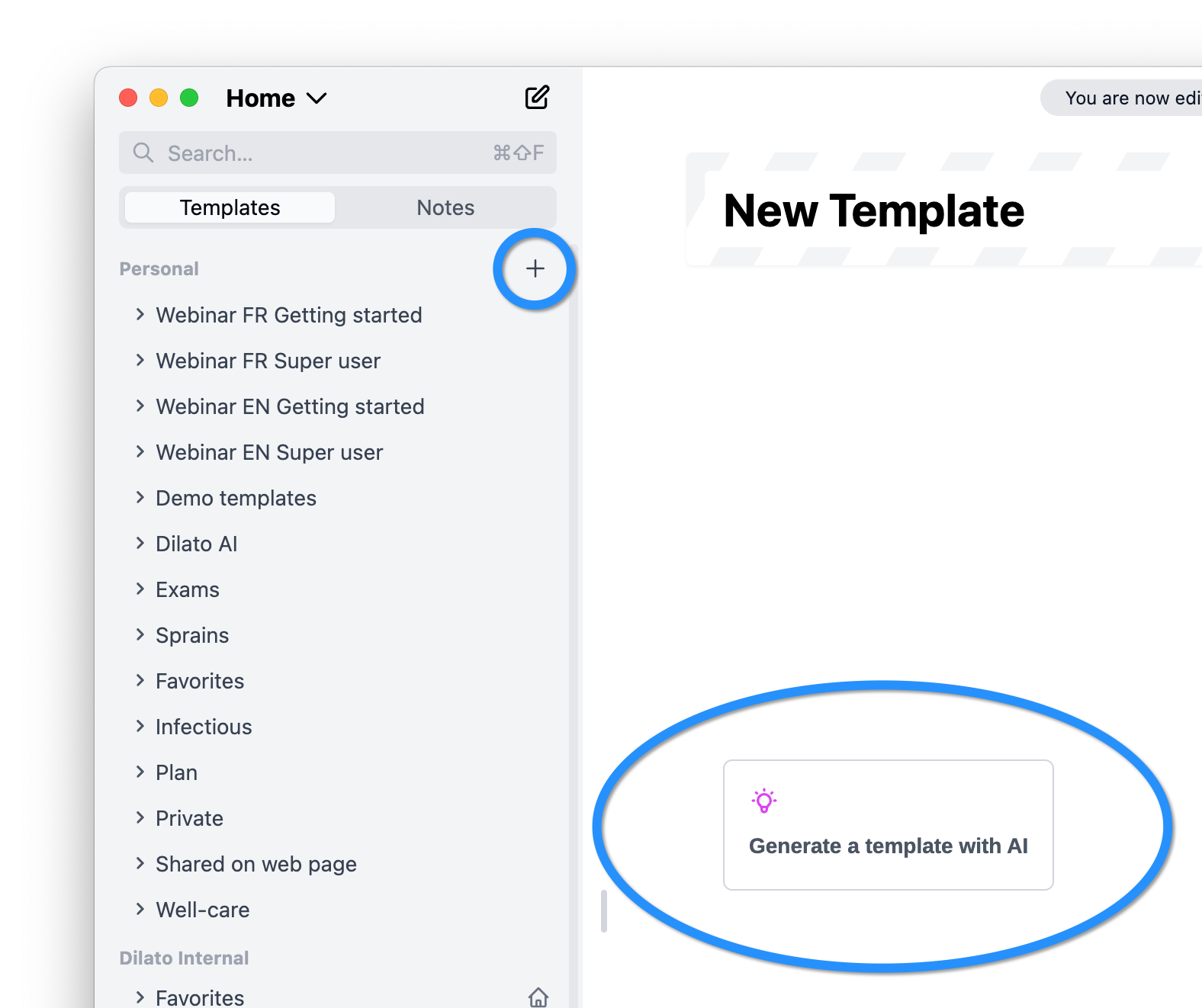 The Template Generator is an AI tool in Dilato to help you create templates. You can save these templates for later or create them on the fly during patient visits.