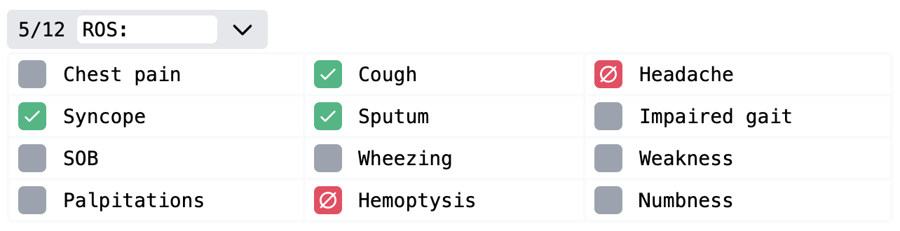 A grid is a large block of choices, perfect for selecting from a long list of items, such as symptoms, treatments, or work-ups.